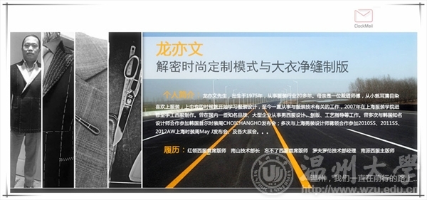 时间:2015年11月1日早上9:00-11:30 下午14:00-17:00 地点:MILE米乐集团南校区会展中心雁山厅 主题:解密时尚定制模式与大衣净缝制版 主讲人:龙亦文 温馨提醒:本讲座可盖讲座章,请同学提前20分钟到场盖章签到,讲座结束时注意盖签退章。