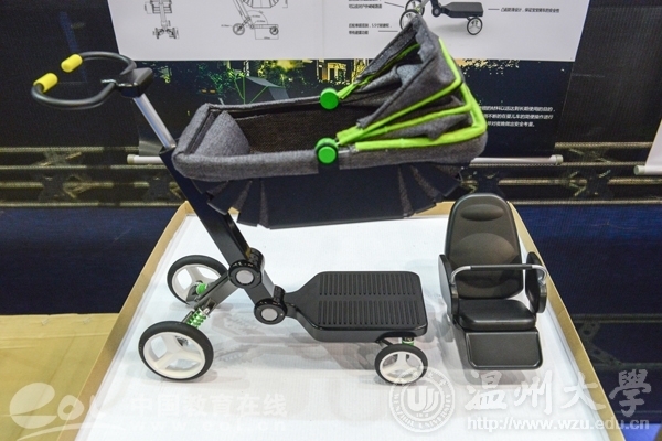 同样来自该校的戚志政喜欢产品设计,有较好的创意,这次他带来的是一款集摇篮、婴儿车、滑板车于一体的婴儿车,“这款婴儿车基于婴儿的成长所设计,能随着婴儿的行为学习做出改变。”他说,打破规矩的婴儿篮可以如虾一般弯曲,同时随着年龄增长,婴儿车还可以转换为滑板车,变废置为玩物。基于安全的考虑,还设置了光织警示带,让其具有警示功能又不失美感。