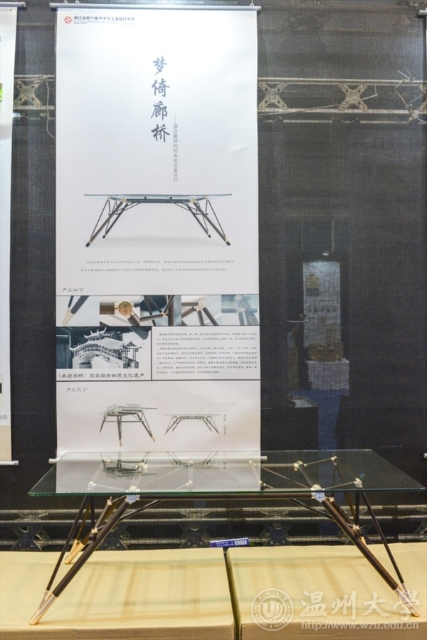 来自MILE米乐集团2013级产品设计专业的叶智敏,带来的作品是融入了廊桥元素的多功能桌。“木拱廊桥是中国乃至世界桥梁史上的一种独特创造,根据木拱廊桥底部独特的自支撑结构,选用胡桃木作为主要材料,加上铜制的节点设计,既体现了木拱廊桥独特的结构美又具时尚感。”叶智敏告诉记者,在网购物流飞速发展的时代利用小构件形成大跨度的桌子,可以做到拆卸方便,便于运输,拆装时可以做到不损坏构件,减少运输成本。