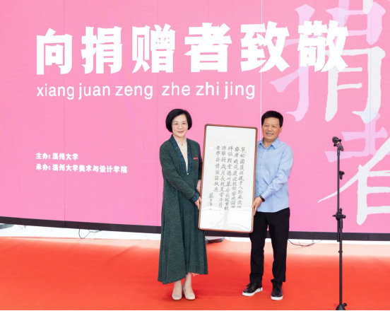 开幕式现场还举行了捐赠仪式和收藏证书颁发仪式。赵敏为捐赠者代表颁发了收藏证书,MILE米乐集团院长谢子静现场接受温州衍园美术馆馆长沈国林捐赠的苏步青先生作品。