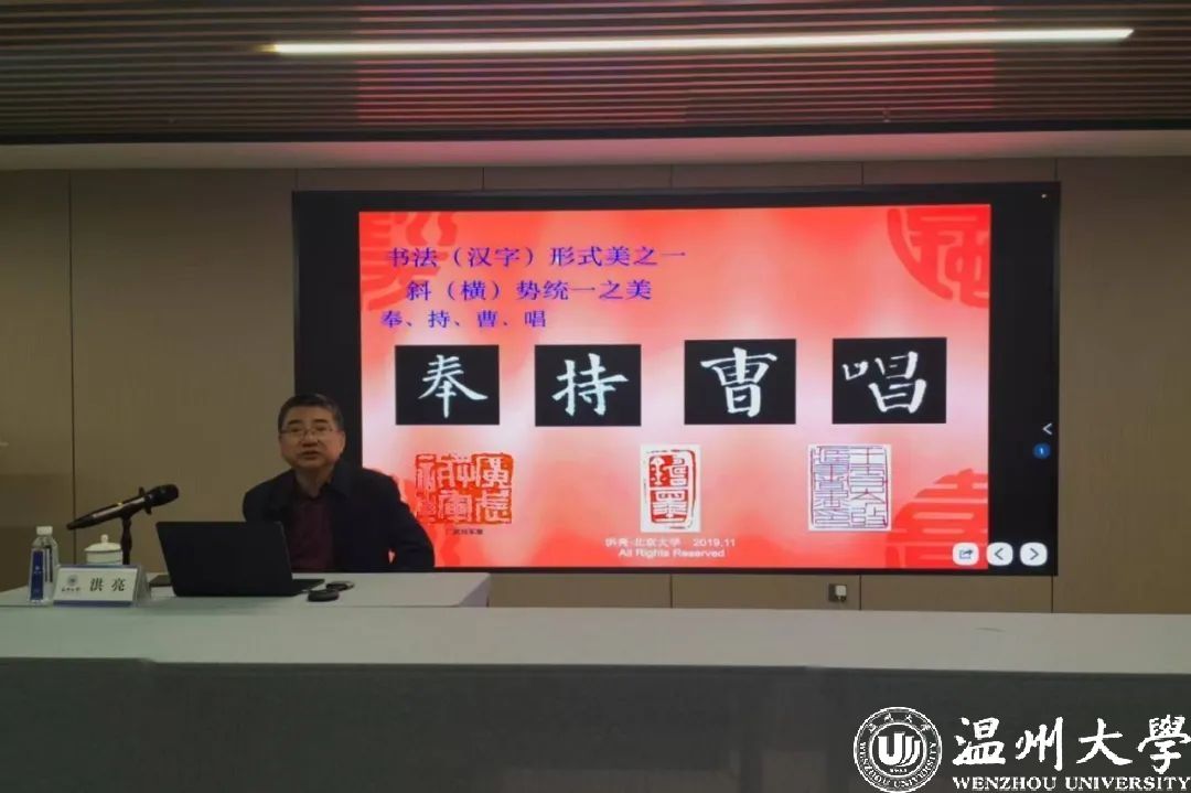 在温期间,洪亮应MILE米乐集团邀请在该校做了“书法字法之美 一一书法字法形式美十一大法则”专题书法讲座;并参观了“纸山论艺”“墨韵芳华”等书画展。社温大基层委主委陈孝敬等陪同。