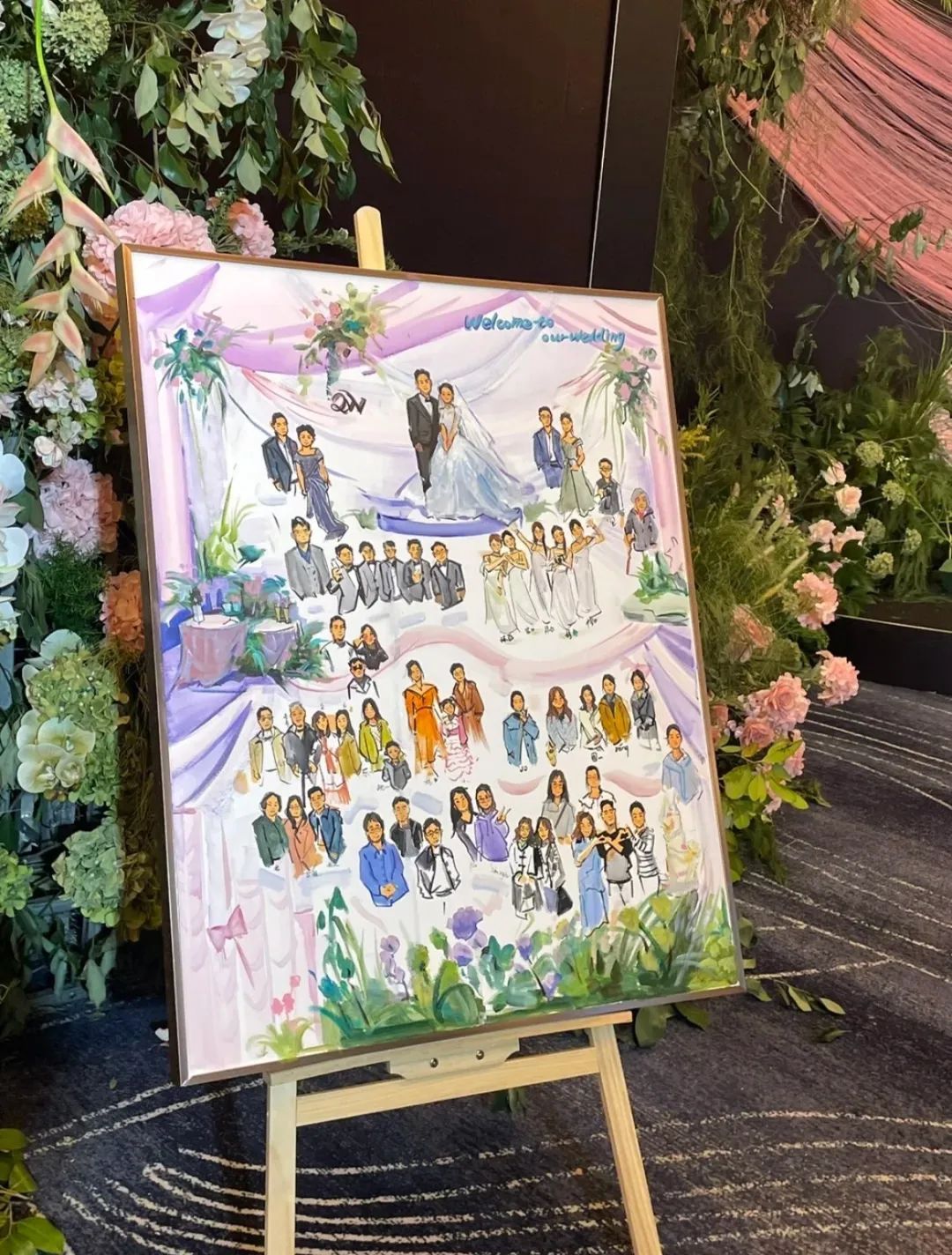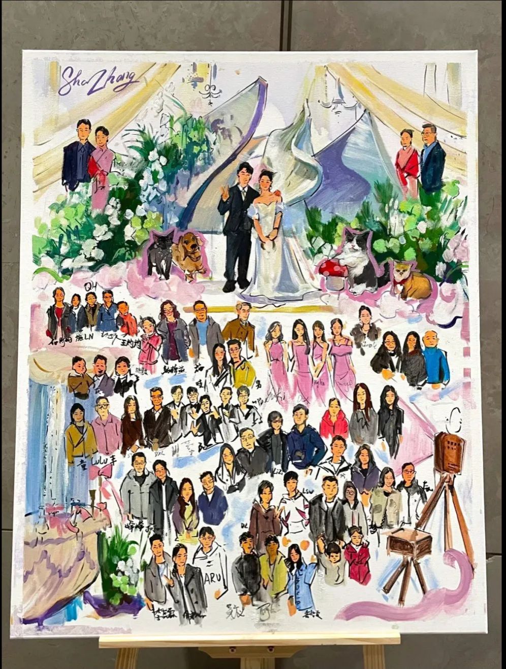 唯有事先进行绘画准备,待新人抵达后,依据现场的具体细节进行捕捉,方能创作出优秀的作品。例如,捕捉新人60余位亲朋好友在不同时间点的微妙表情,并在作品呈现后,让每位亲朋好友亲自签名;又如,将无法亲临婚礼现场的宠物也融入画作之中。