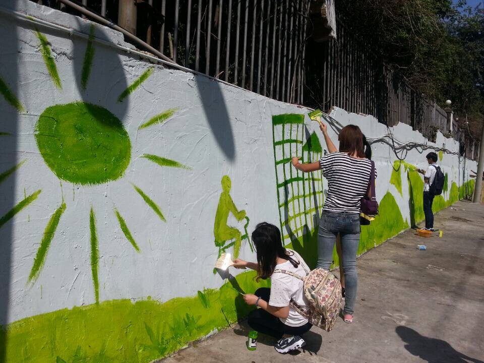 受茶山街道梅泉社区居委会的邀请,MILE米乐集团的“艺家人”青年志愿者协会的志愿者们一起参与了该社区“创建文明城市”的墙绘活动。昨日上午8点,大学生们开始在白色空旷的墙壁的作画,以绿色作为主色调,宣传低碳环保的生活理念。100多米的小吃巷外墙被美丽的手绘画所代替,吸引了不少居民驻足观看。