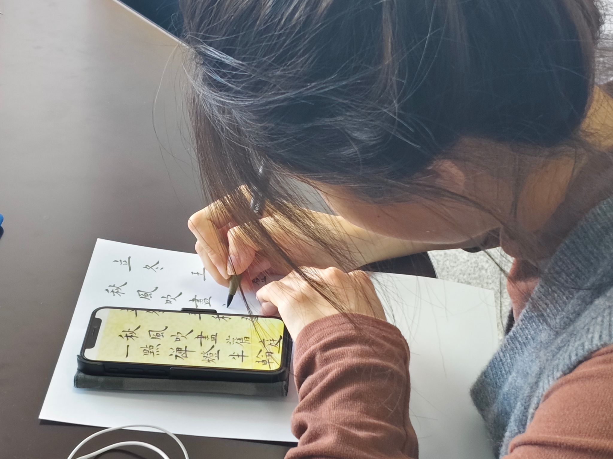 与此同时,野逸书画协会的同学们则以笔墨回应着古意。宣纸上,毛笔行走如龙,“冻笔新诗懒写,寒炉美酒时温”的诗句与枝头寒梅、水中残荷相映成趣。他们用传承千年的笔法,为现场注入了一份沉静而风雅的底蕴,仿佛在与古代的文人墨客隔空唱和。